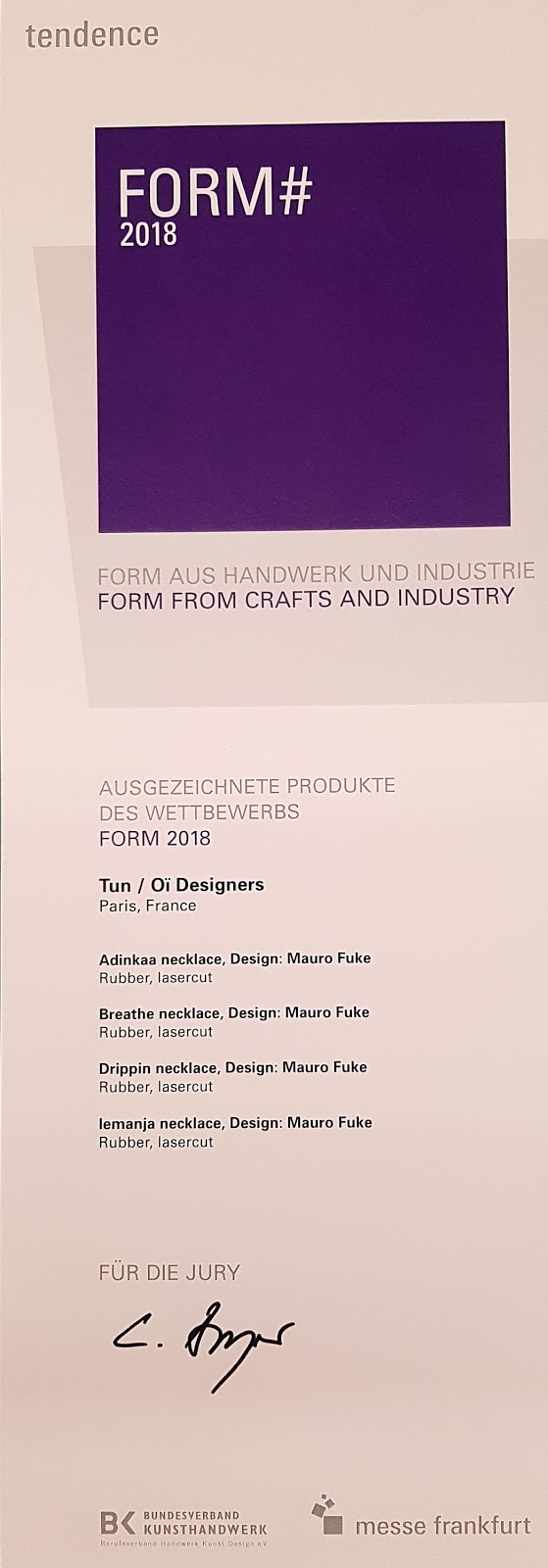 designTun na Feira Tendence / Frankfurt. Onde pelo 2º ano consecutivo ganha o Prêmio Form pela excelência no desenho com os Colares Matrix e Gateway